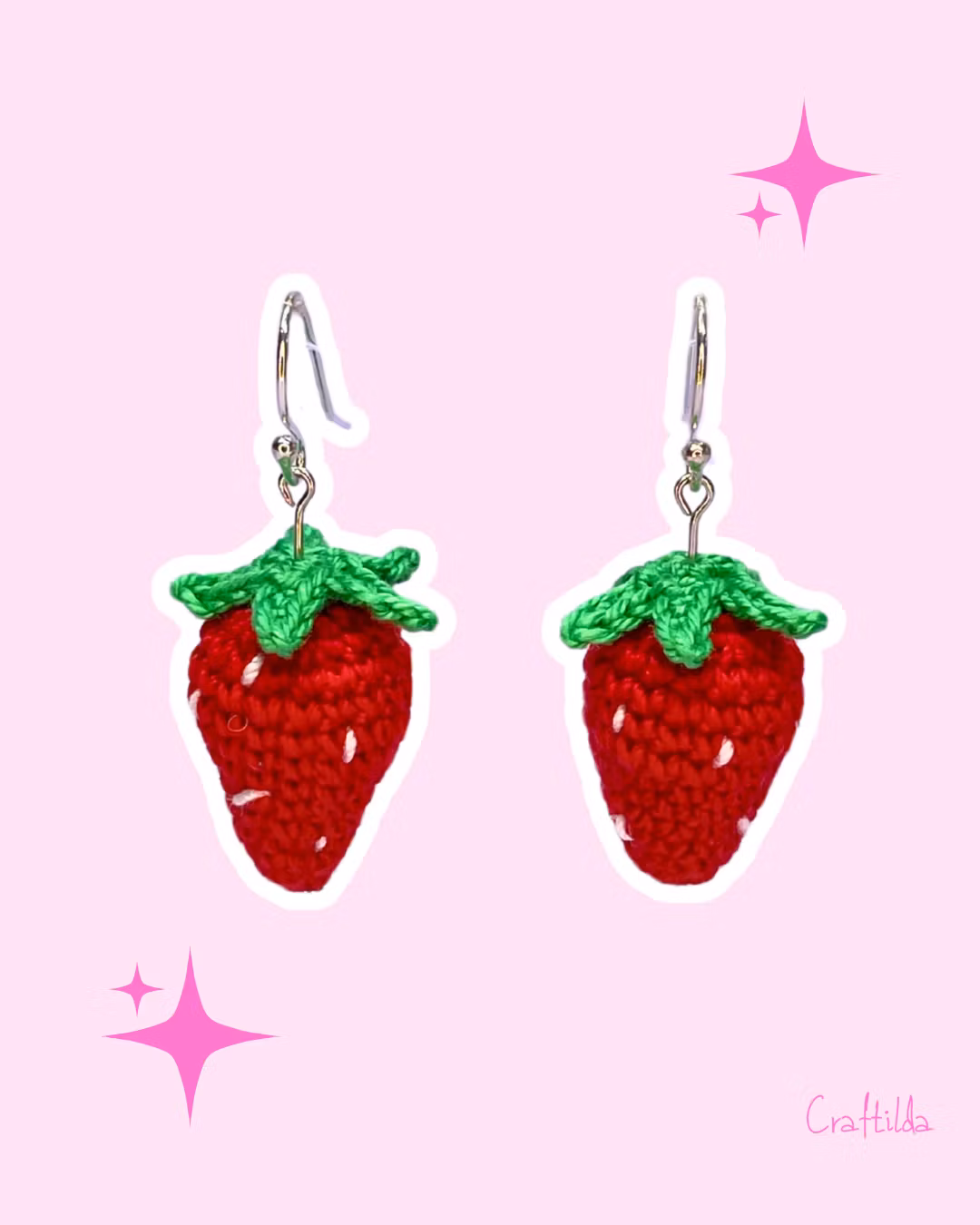 Virkade jordgubbsörhängen! Handgjorda örhängen formade som jordgubbar. Virkade i bomullsgarn med en polystyrenkula inuti för att behålla formen. Öronkrokar