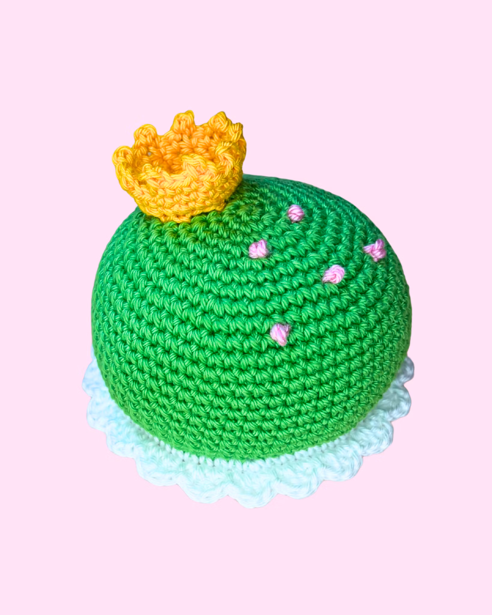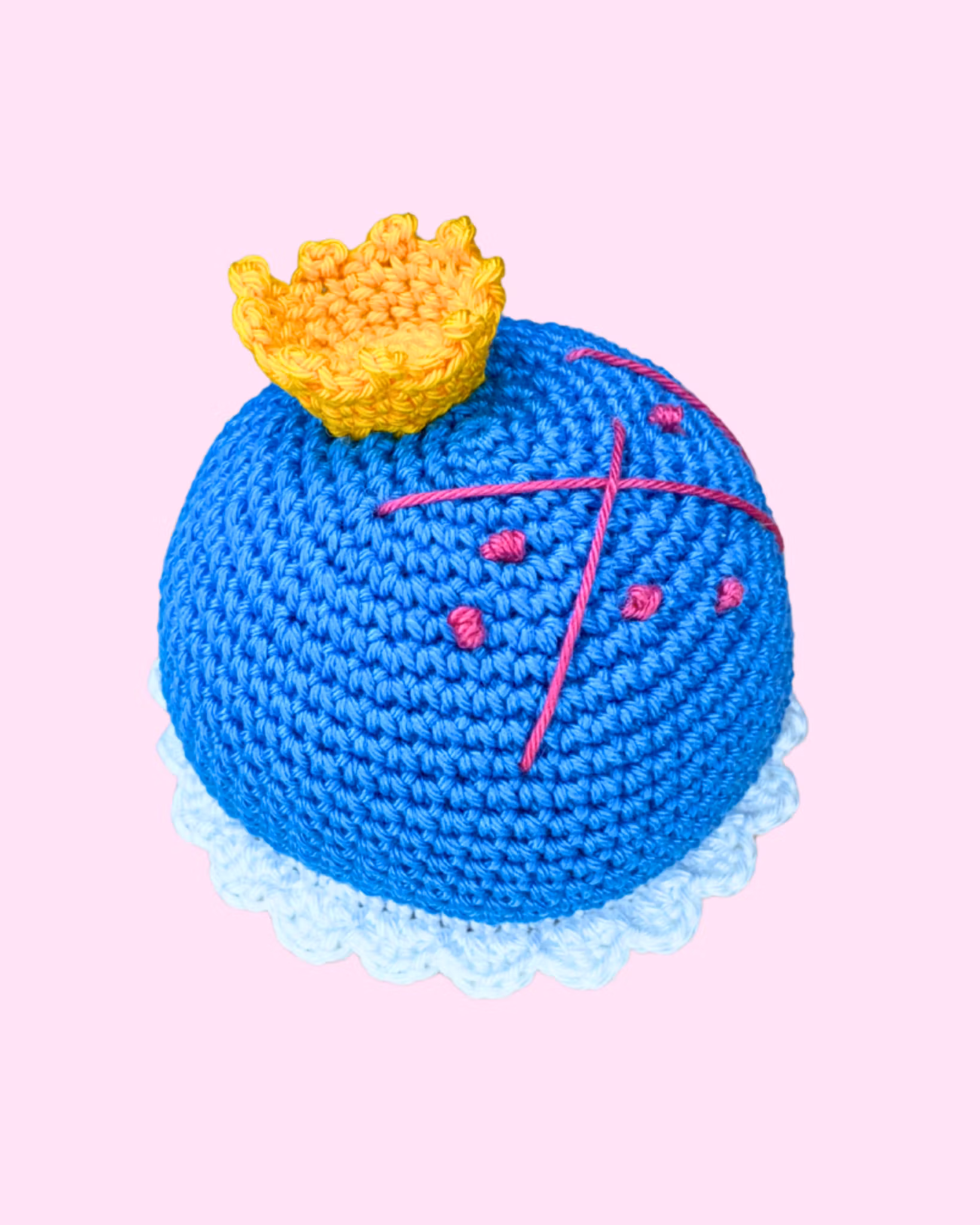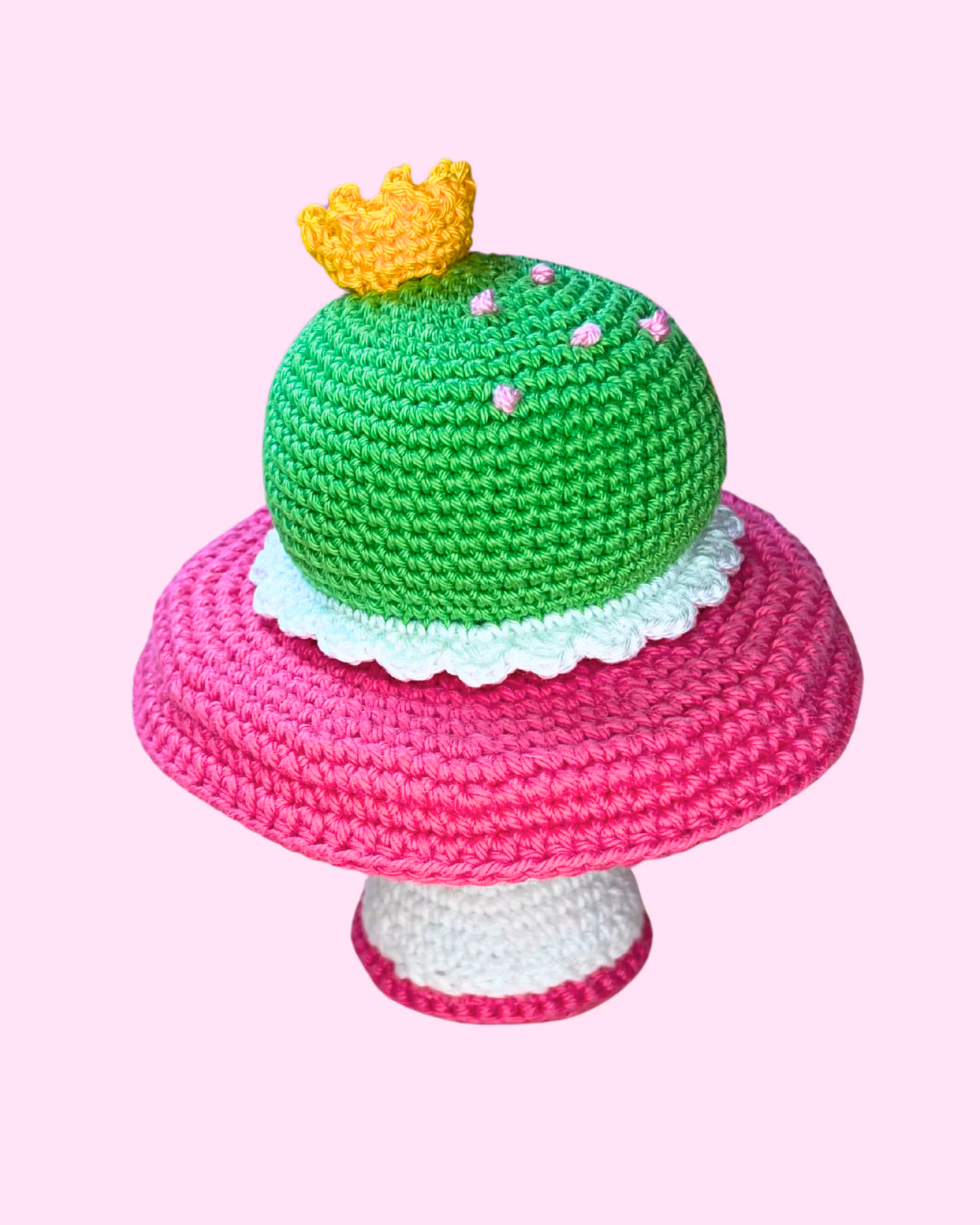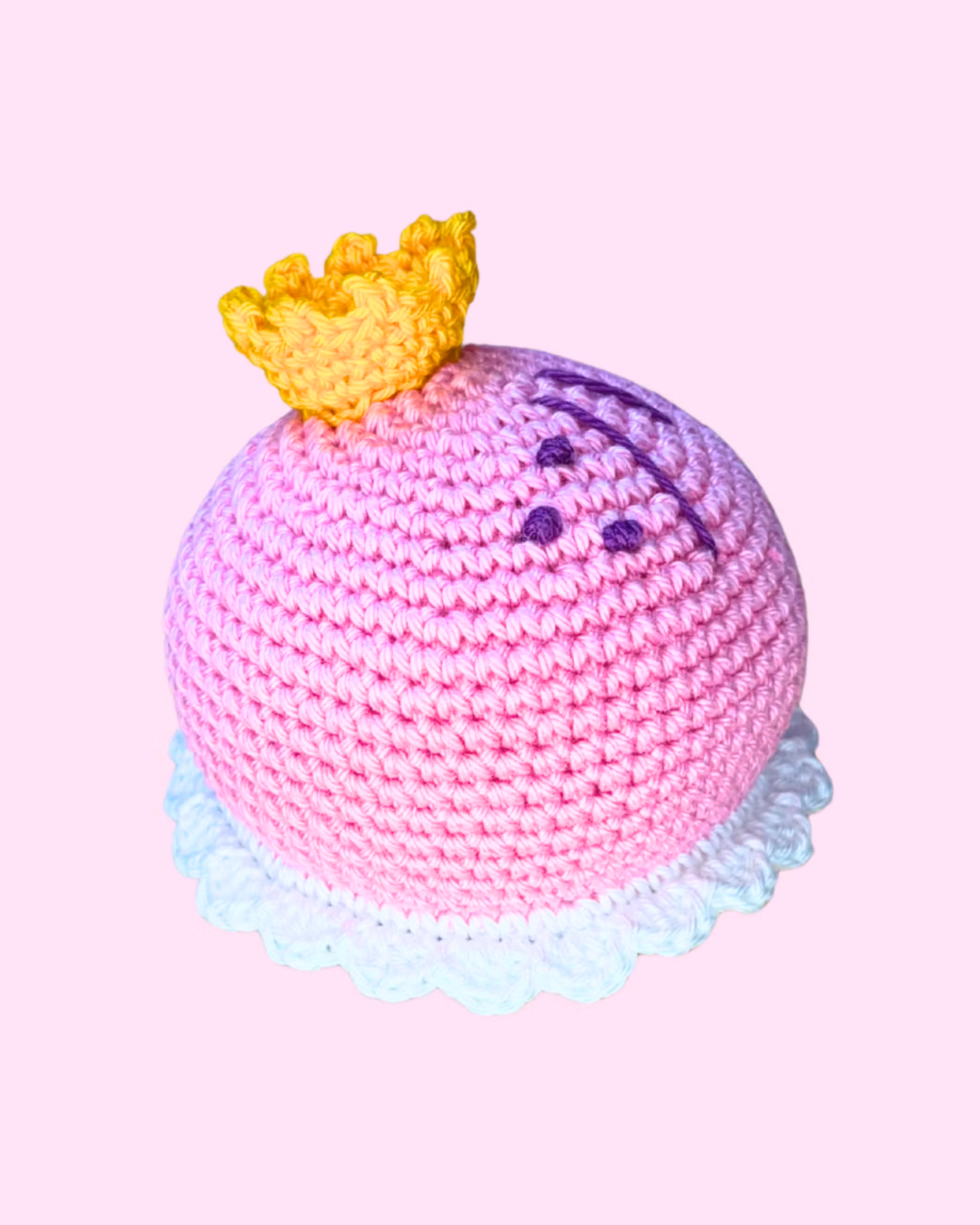 Ett detaljerat virkmönster på en prinsesstårta i miniatyr med en liten krona på toppen. Perfekt för dig som älskar att virka bakverk och skapa lekfulla dekorationer.